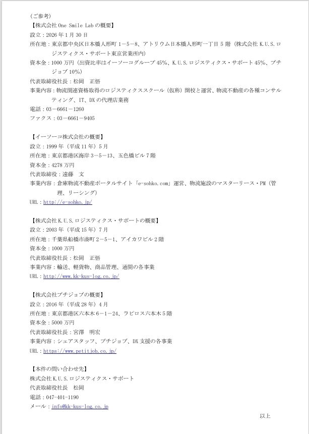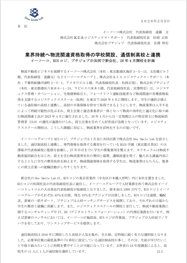 当社株式会社K.U.S.ロジスティクス・サポートは、物流不動産ビジネスを展開するイーソーコ株式会社などイーソーコグループと株式会社プチジョブの3社で、物流分野における事業拡大および新たな価値創出を目的として、株式会社OneSmileLabを設立いたしましたので、お知らせいたします。