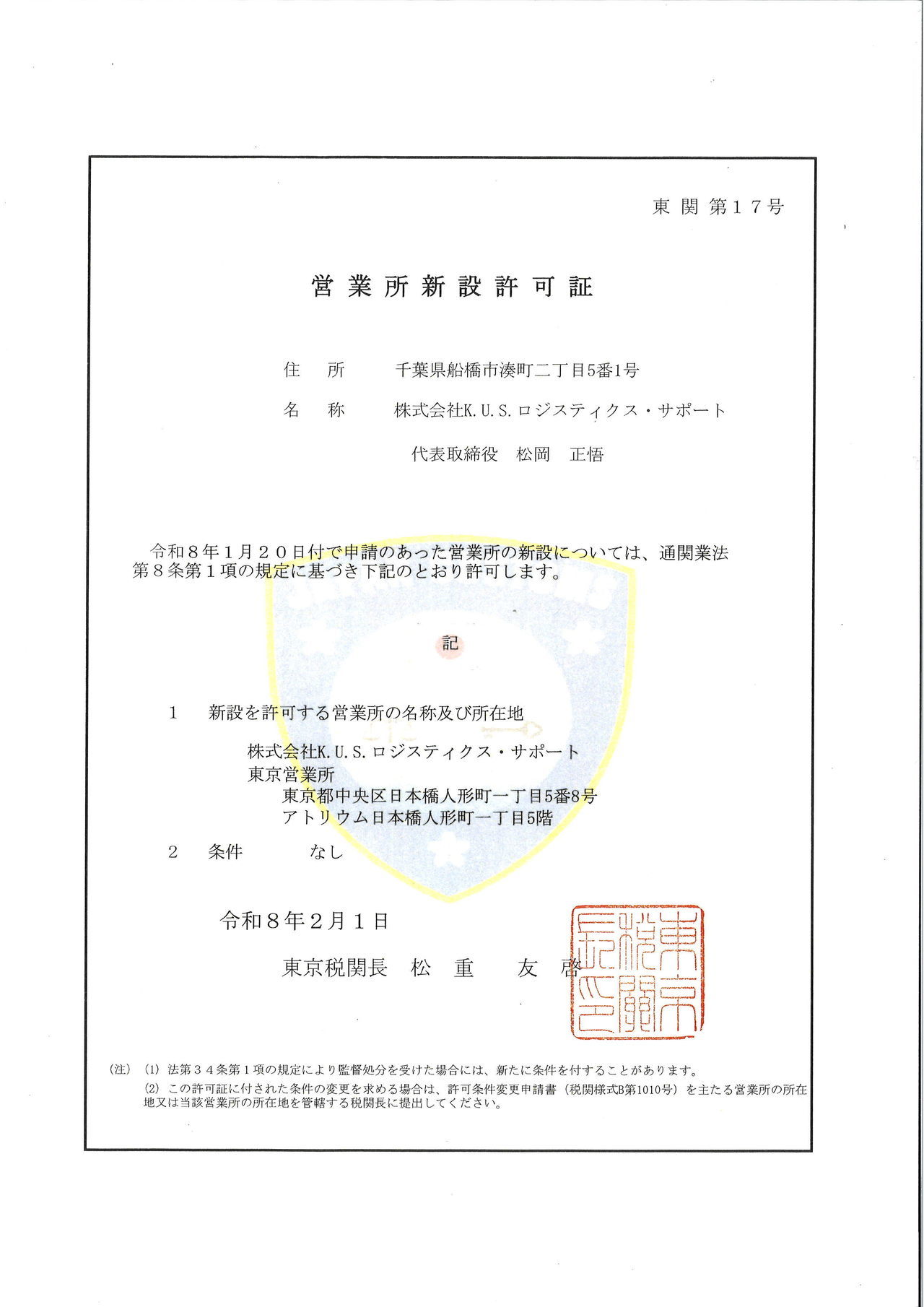 当社は成田空港にて航空貨物の通関業を主としてきましたが、海上貨物の通関も直接取り扱えるよう、東京営業所にて通関業新設許可を取得いたしました。